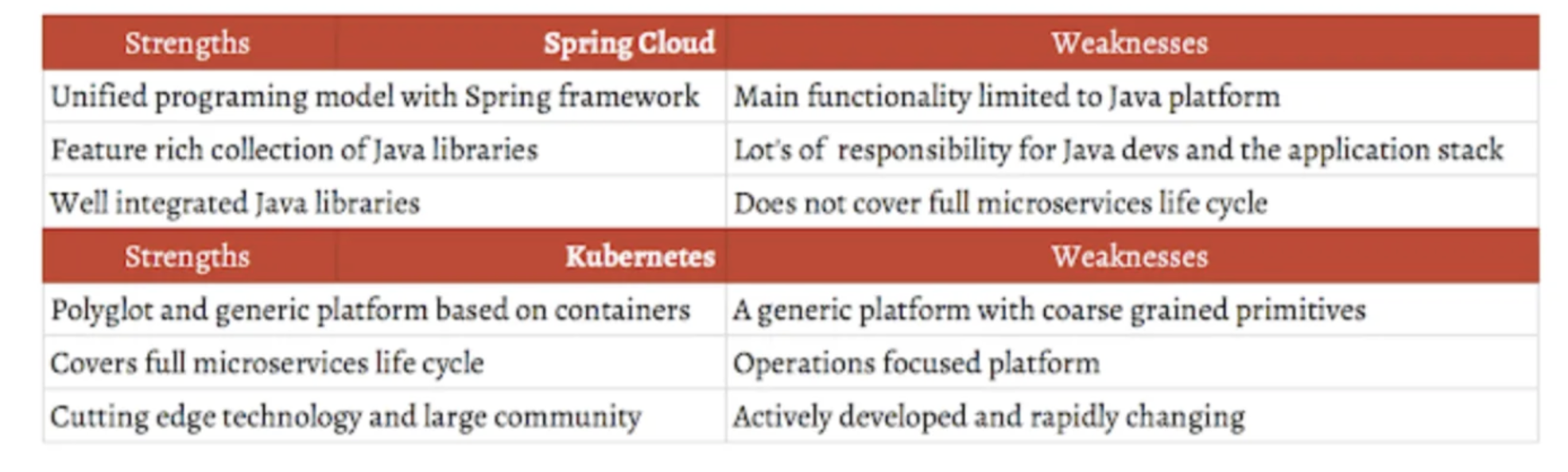 필요 기술과 그에 대한 스펙은 Spring Cloud와 Kubernetes에서 아래와 같이 구분된다.
