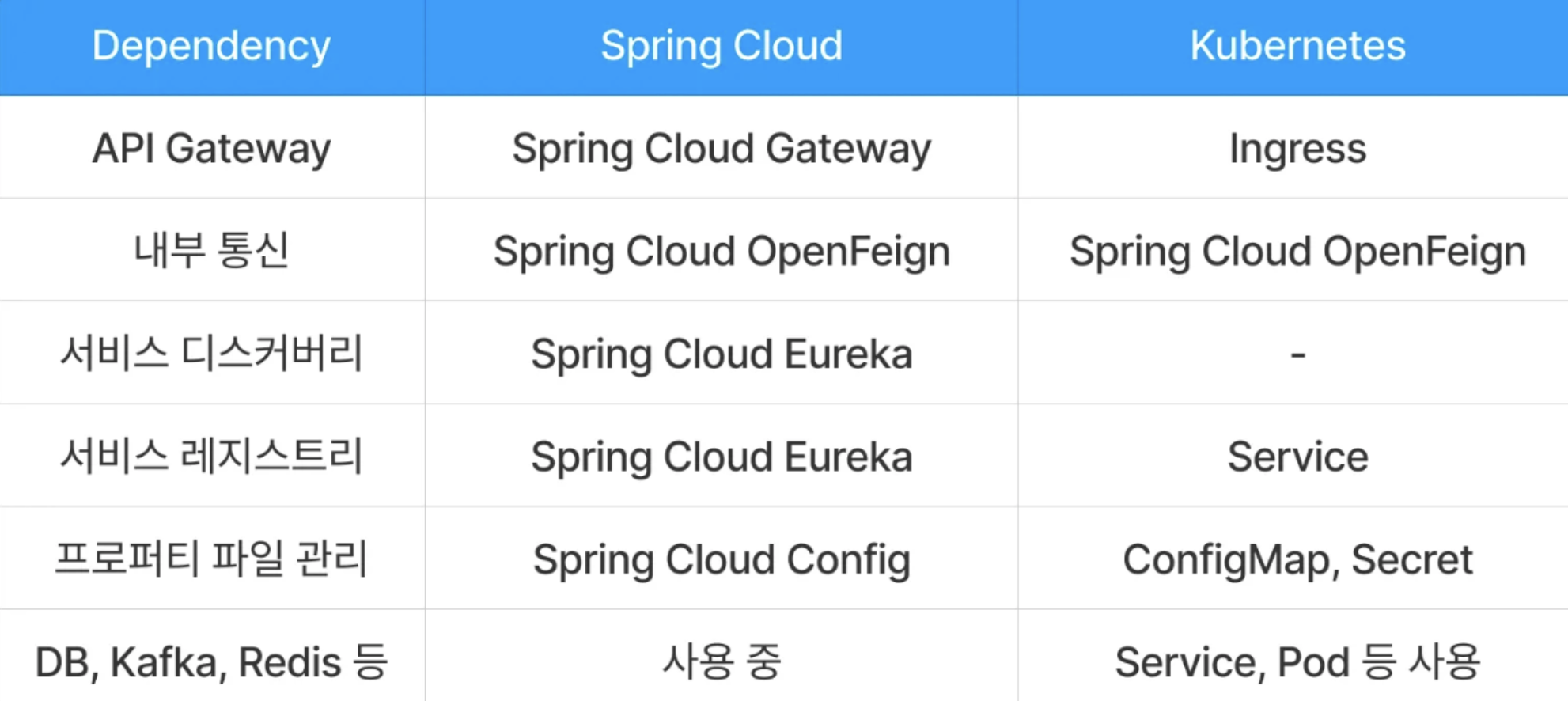 Kubernetes의 객체들이 MSA를 위해 사용하던 Spring Cloud 서비스들의 역할을 대체할 수 있게 되었다.